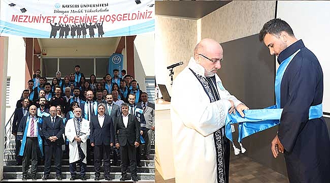 Bünyan MYO Şadi Korkmaz Konferans Salonu’nda gerçekleştirilen mezuniyet törenine Rektör Prof. Dr. Kurtuluş Karamustafa, Bünyan Kaymakamı Turgut Gülen, Bünyan Belediye Başkanı Özhan Altun, Bünyan MYO Müdürü Doç. Dr. Sedat Per, Safiye Çıkrıkçıoğlu MYO Müdürü Prof. Dr. Ertuğrul Şahmetlioğlu, Pınarbaşı Suna Yalçın MYO Müdürü Doç. Dr. Bahatdin Daşbaşı, hayırsever Ramazan Polat, ilçe protokolü, öğretim elemanları, öğrenciler ve aileler katıldı.