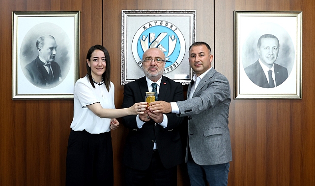 Bu kapsamda Yeşilhisar MYO Müdürü Dr. Öğr. Üyesi Zekiye Kocakaya ile Bitkisel ve Hayvansal Üretim Bölümü Öğr. Gör. Zafer Tabur arıcılık uygulaması olarak ürettikleri ilk poleni Rektör Prof. Dr. Kurtuluş Karamustafa’ya takdim etti.