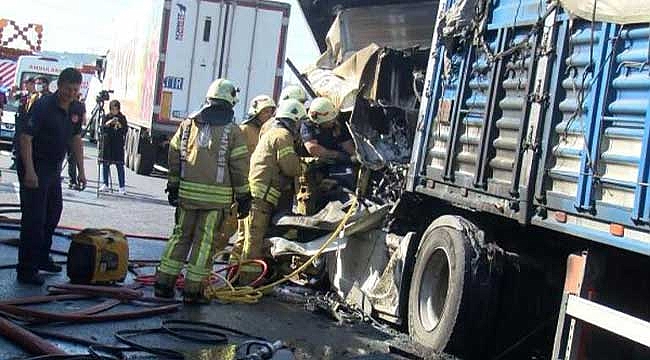 Kaza, saat 16.30 sıralarında Sancaktepe Kuzey Marmara Otoyolu’nda meydana geldi. Yavuz Sultan Selim Köprüsü istikametinde ilerleyen Seyfi Erol (47) yönetimindeki 39 AAU 575 plakalı TIR, bilinmeyen nedenle kontrolden çıkarak önünde seyreden Nazım İnce yönetimindeki 35 SGE 93 plakalı TIR’a arkadan çarptı. Çarpan TIR’da yangın çıkarken, şoför bulunduğu yerde sıkıştı.