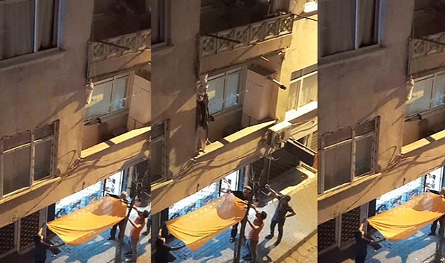 Güngören'de üst kat balkonunun duvarında ipe dolanarak asılı kalan kediyi alt katta oturan kadın canını tehlikeye atarak kurtardı. Kadın kendi evinin balkon kenarına çıkıp kediyi kurtarmaya çalışırken mahalle sakinleri battaniye açıp güvenlik önlemi aldı.