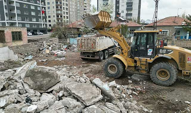 Melikgazi Belediyesi Yıldırım Beyazıt Mahallesinde kentsel dönüşüm kapsamında yıkımını yaptığı gecekonduların hafriyat kaldırma çalışmasını yapıyor.