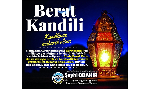 Kayseri Esnaf ve Sanatkarlar Odaları Birliği Başkanı Şeyhi Odakır, Berat Kandili dolayısıyla bir mesaj paylaştı. Başkan Odakır mesajında:” Ramazan Ayı’nın müjdecisi Berat Kandili’ni milletçe yaşadığımız felaketin üzüntüsü içerisinde idrak ediyoruz. Allah, Berat Kandili vesilesiyle birlik ve beraberlik içerisinde yaralarımızı sarmayı nasip etsin. Dualarımız kabul, Berat Kandilimiz mübarek olsun. “dedi.