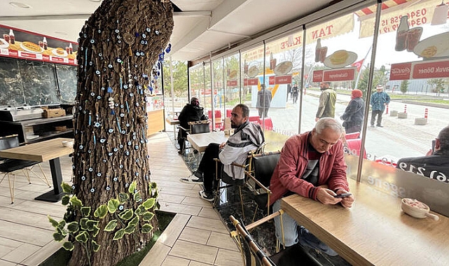 Sivas Cumhuriyet Üniversitesi Tıp Fakültesi Hastanesi poliklinik binası önündeki kafeyi 4 yıl önce devralan Esnaf Hilal Tan, gerekli izinleri alarak iş yerini genişletmeye karar verdi.Tan, üniversitenin kuruluş zamanlarında dikildiği tahmin edilen ve genişletilecek alan içinde kalan salkım söğüt ağacının kesilmesine ise razı olmadı.Ağacı da kafesinin içerisine dahil ederek farklı bir konsept oluşturdu. Nazar boncukları ve mini saatlerle süslenen ağaç, müşterilerin de ilgisini çekiyor. 'KAFEYE DE RENK VERDİ' Doğayı çok sevdiğini ve ağacı kesmeye kıyamadıklarını söyleyen Hilal Tan, "Buraya 4 yıl önce ilk geldiğimizde ağaç, sade bir şekildeydi. Sonra zamanla ağaca dantel örmeyi düşündüm. Ağaç çok büyük olduğu için dantel yapamadım.Böyle süslemeye karar verdik. Mini bir Kapadokya'mız oldu. Özellikle öğrenciler çok seviyor. Biz de yapılırken kesilmesini istemedik. Bu şekilde kafeye de bir renk verdi. Müşteriler, fotoğraf çekiyor. 4 yıldır bu şekilde. Kapıdan giren misafirlerimizi bizden önce ağacımız karşılıyor. Dışarıdan da dikkat çekiyor" dedi.Müşteriler ise içeride hoş bir ortam olduğunu, ağaca zarar verilmeden böyle bir çalışma yapılmasından memnun kaldıklarını dile getirdi.