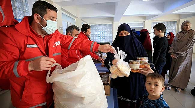Afet Yönetimi Müdürlüğünde hazırlanan üç öğün yemek, kişi sayısına göre paketleniyor. Yemekler, Dışişleri Bakanlığının organizasyonuyla tahliye edilen Kırım Tatar Türklerinin misafir edildiği Kredi ve Yurtlar Kurumuna getiriliyor.