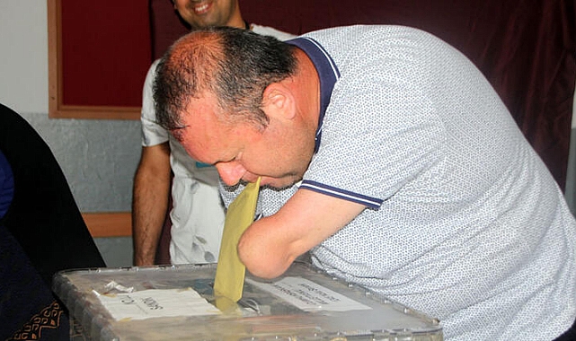 Antalya'nın Serik ilçesinde 31 yıl önce geçirdiği kaza sonucu iki kolu da ampute edilen Bülent Bodur (44), oyunu kızının yardımıyla kullanırken, zarfı ağzıyla sandığa attı.