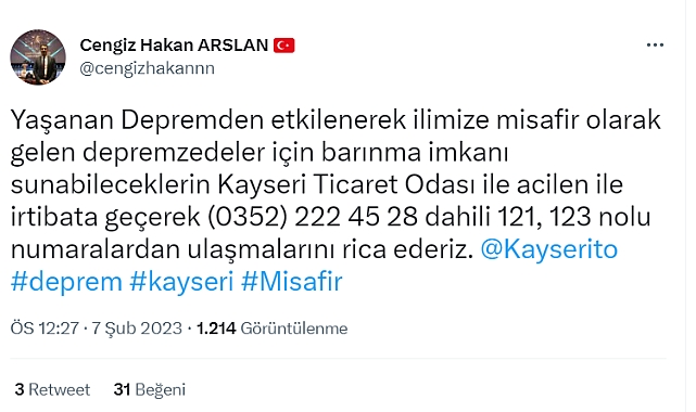 KTO Meclis Başkanı Cengiz Hakan Arslan, barınma imkanı sunabileceklerini ifade etti. Kayseri Ticaret Odası Meclis Başkanı Cengiz Hakan Arslan sosyal medya hesabından yapılan paylaşımda: "Yaşanan Depremden etkilenerek ilimize misafir olarak gelen depremzedeler için barınma imkanı sunabileceklerin Kayseri Ticaret Odası ile acilen ile irtibata geçerek (0352) 222 45 28 dahili 121, 123 nolu numaralardan ulaşmalarını rica ederiz. " ifadelerine yer verdi.