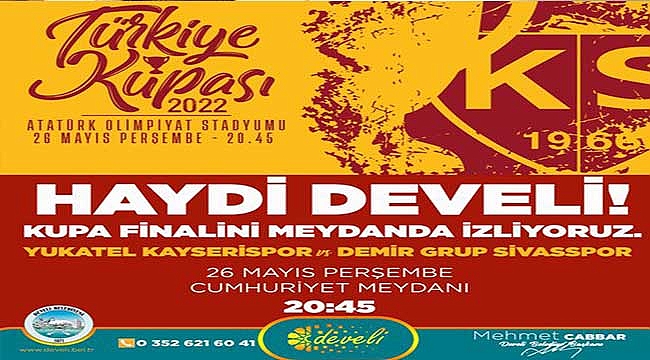Develi Belediye Başkanı Mehmet Cabbar: "Yukatel Kayseri Sporumuzun 26 Mayıs Perşembe Günü (yarın) 20:45’te DG Sivasspor'la oynayacağı Ziraat Türkiye Kupası final maçının heyecanını maça gidemeyen hemşerilerimizle Cumhuriyet Meydanımızdaki dev ekranda izleyerek yaşayacağız. Haydi Develi! Şimdi şehrimizin takımına destek olma zamanı." ifadelerini kullandı.