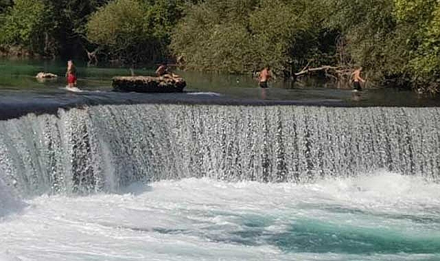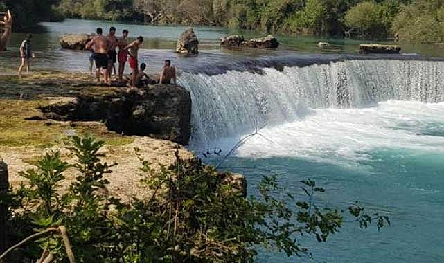Antalya'da Manavgat Şelalesi'ni ziyaret eden bazı tatilciler, 'Yüzmek, suya girmek tehlikelidir' yazılı tabelalarına rağmen suya atlayıp, kayalıklara oturdu.