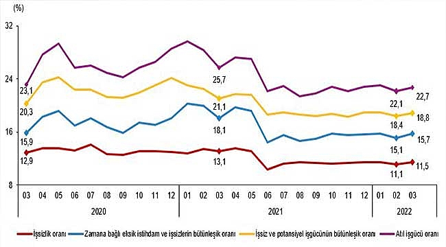 Hane halkı İşgücü Araştırması sonuçlarına göre; 15 ve daha yukarı yaştaki kişilerde işsiz sayısı 2022 yılı Mart ayında bir önceki aya göre 153 bin kişi artarak 3 milyon 894 bin kişi oldu. İşsizlik oranı ise 0,4 puanlık artış ile yüzde 11,5 seviyesinde gerçekleşti. İşsizlik oranı erkeklerde yüzde 10,3 iken kadınlarda yüzde 13,9 olarak tahmin edildi.