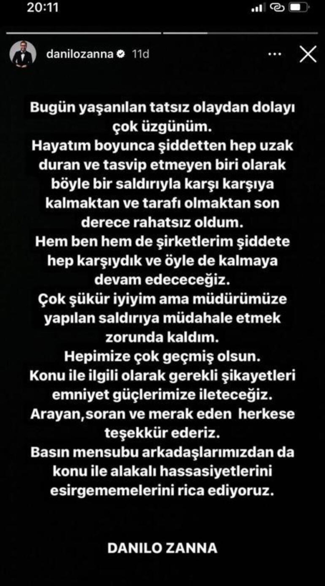 Sarıyer'de bulunan bir avmde restoranı bulunan İtalyan Şef Danilo Zanna, iş yerine geldiği sırada iki kişinin saldırısına uğradı. Saldırı anları bir vatandaş tarafından cep telefonu ile saniye saniye kaydedildi. Görüntülerde, iki kişinin Zanna'ya tekme ve yumruklarla saldırdığı ve Zanna'nın da kendisine saldıranlara karşılık verdiği görülüyor. Olayın ardından olay yerine gelen polis ekipleri İtalyan Şef Danilo Zanna ve ona saldıranları ifadelerini almak üzere polis merkezine götürdü. İTALYAN ŞEF DANİLO ZANNA MEKANININ ÖNÜNDE SALDIRIYA UĞRAMASIYLA İLGİLİ AÇIKLAMA YAPTI Olayla ilgili sosyal medya hesabı üzerinden açıklama yapan Danilo Zanna; "Bugün yaşanılan tatsız olaydan dolayı çok üzgünüm. Hayatım boyunca şiddetten hep uzak duran ve tasvip etmeyen biri olarak böyle bir saldırıyla karşı karşıya kalmaktan ve tarafı olmaktan son derece rahatsız oldum. Hem ben, hem de şirketlerim şiddete hep karşıydık ve öyle de kalmaya devam edeceğiz. Çok şükür iyiyim ama müdürümüze yapılan saldırıya müdahale etmek zorunda kaldım. Hepimize çok geçmiş olsun. Konu ile ilgili olarak gerekli şikayetleri emniyet güçlerimize ileteceğiz. Arayan, soran ve merak eden herkese teşekkürler" dedi.