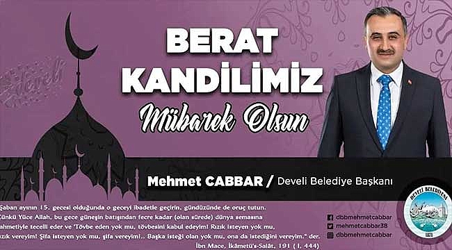 Develi Belediye Başkanı Mehmet Cabbar sosyal medya hesabından 'Berat Kandili' mesajı yayımladı. Başkan Cabbar mesajında:"On bir ayın sultanı, mübarek Ramazan-ı Şerif’in müjdecisi, af ve mağfiret kapılarının sonuna kadar açıldığı bu mübarek Berat Gecesinin, tüm insanlığın her türlü maddi-manevi kirlerinden arınarak felaha ulaşmasına vesile olmasını Cenab-ı Allah’tan niyaz ederim" dedi.