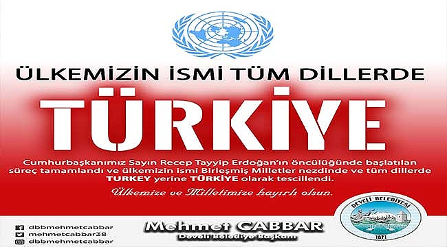 Develi Belediye Başkanı Mehmet Cabbar, yayımlamış olduğu mesajında:" Ülkemizin ismi, tüm dillerde "TÜRKİYE" Cumhurbaşkanımız Sayın Recep Tayyip ERDOĞAN’ın öncülüğünde başlatılan süreç tamamlandı ve ülkemizin ismi Birleşmiş Milletler nezdinde ve tüm dillerde TURKEY yerine TÜRKİYE olarak tescillendi. Ülkemiz ve milletimiz için hayırlı olsun. " ifadelerine yer verdi.