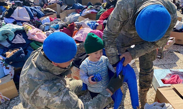 Türk Silahlı Kuvvetleri (TSK), deprem bölgesinde arama- kurtarma çalışmalarının yanı sıra afetzedelerin yaralarının sarılmasına yönelik çalışmalarını da sürdürüyor. Mehmetçik, deprem bölgesinde çadır kent ve konteyner kentlerin kurulumundan güvenliğine, yardım malzemelerinin afetzedelere ulaştırılmasından bölgede yemek ve ekmek dağıtımına kadar her alanda çalışma yapıyor. Mehmetçik, bölgeye ulaştırdığı yardım malzemelerini de afetzedelere teslim ediyor. Askerler depremden etkilenen çocuklara yardımları teslim ederken çekilen fotoğraflar, Milli Savunma Bakanlığı'nın Twitter'daki hesabından paylaşıldı. Açıklamada, "Milletimizin her bir ferdi yardımda yarışır oldu. Ortak amaçtır tebessüm bırakmak yüzlerde, umudu yeniden yeşertmektir yüreklerde. En büyük onur ve görev ise; ulaştırmaktır emanetleri sahiplerine. Briz beraberiz" denildi.