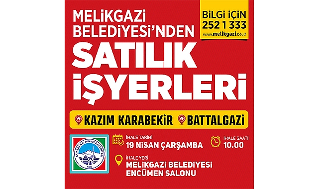 Melikgazi Belediyesi Kazım Karabekir ve Battalgazi Mahallesinde bulunan 6 adet işyerini düzenlenecek ihale ile satışa sunacak.