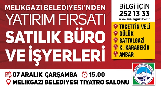 Melikgazi Belediye Başkanı Dr. Mustafa Palancıoğlu, 07 Aralık Çarşamba günü saat 15.00’te mülkiyeti belediyeye ait olan 22 adet ofis ve işyeri için açık teklif usulüyle satış ihalesi yapacaklarını söyledi.