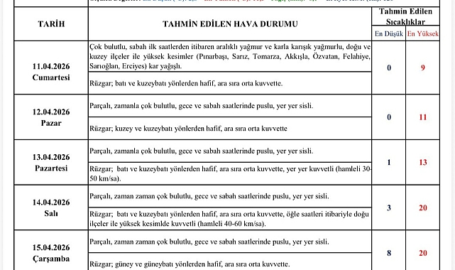 Yapılan son değerlendirmelere göre, 11 Nisan Cumartesi günü çok bulutlu bir hava beklenirken, sabah saatlerinden itibaren aralıklı yağmur ve yüksek kesimlerde kar yağışı öngörülüyor. En düşük sıcaklık 0, en yüksek sıcaklık 9 derece olacak. 12 Nisan Pazar günü parçalı ve zamanla çok bulutlu bir hava tahmin edilirken, gece ve sabah saatlerinde pus ve yer yer sis görülebilecek. Sıcaklıkların 0 ile 11 derece arasında seyretmesi bekleniyor. 13 Nisan Pazartesi günü de parçalı ve çok bulutlu hava etkisini sürdürecek. Rüzgarın zaman zaman kuvvetli (30-50 km/saat) esmesi beklenirken, sıcaklıkların 1 ile 13 derece arasında olacağı tahmin ediliyor. 14 ve 15 Nisan tarihlerinde parçalı ve zaman zaman çok bulutlu bir hava öngörülürken, sıcaklıkların salı günü 3 ile 20, çarşamba günü ise 8 ile 20 derece arasında olması bekleniyor.