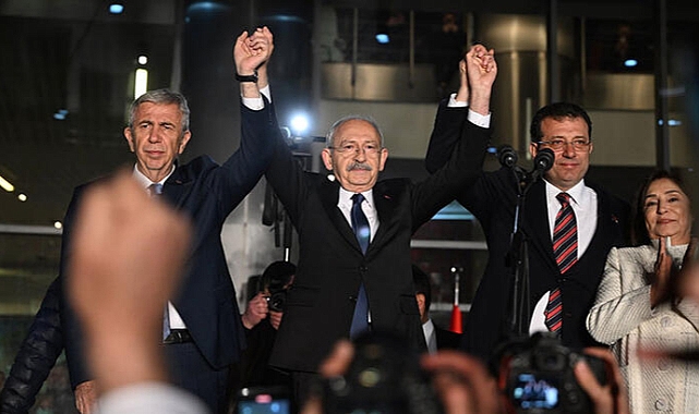 Altılı Masa'nın adayı Kemal Kılıçdaroğlu, CHP Genel Merkezi önünde eşi eşi Selvi Kılıçdaroğlu, İstanbul Büyükşehir Belediye Başkanı Ekrem İmamoğlu ve Ankara Büyükşehir Belediye Başkanı Mansur Yavaş ile birlikte vatandaşlara seslendi.