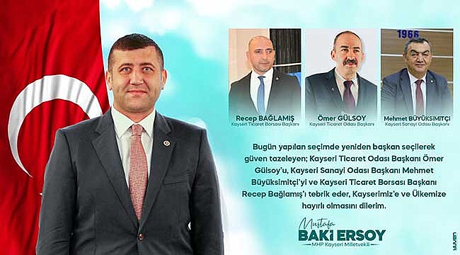 Milletvekili Baki Ersoy, sosyal medya hesabından yaptığı paylaşımda, “Dün yapılan seçimde yeniden başkan seçilerek güven tazeleyen; Kayseri Ticaret Odası Başkanımız Ömer Gülsoy’u, Kayseri Sanayi Odası Başkanımız Mehmet Büyüksimitçi’yi ve Kayseri Ticaret Borsası Başkanımız Recep Bağlamış’ı tebrik eder, Kayserimiz’e ve Ülkemize hayırlı olmasını dilerim” ifadelerini kullandı.