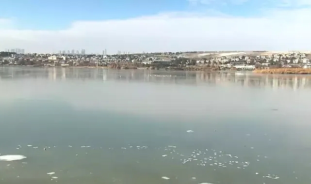 Gölbaşı ilçesindeki Mogan Gölü'nün yüzeyi de soğuk havanın etkisiyle buz tuttu. Gölde oluşan buz tabakasının üzerindeki kuşlar dikkat çekti.