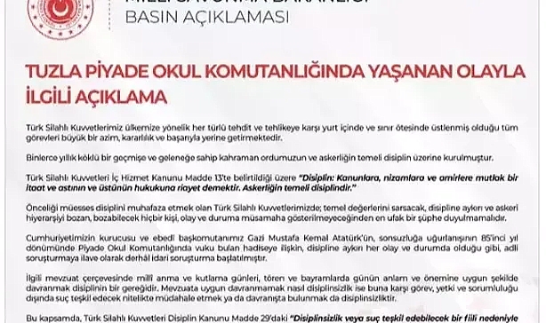 Bakanlığın sosyal medya hesabından Tuzla Piyade Okul Komutanlığı'na 10 Kasım'da yaşanan olaya ilişkin açıklama yapıldı. Açıklamada, "Türk Silahlı Kuvvetlerimiz ülkemize yönelik her türlü tehdit ve tehlikeye karşı yurt içinde ve sınır ötesinde üstlenmiş olduğu tüm görevleri büyük bir azim, kararlılık ve başarıyla yerine getirmektedir. Binlerce yıllık köklü bir geçmişe ve geleneğe sahip kahraman ordumuzun ve askerliğin temeli disiplin üzerine kurulmuştur. Türk Silahlı Kuvvetleri İç Hizmet Kanunu Madde 13'te belirtildiği üzere 'Disiplin: Kanunlara, nizamlara ve amirlere mutlak bir itaat ve astının ve üstünün hukukuna riayet demektir. Askerliğin temeli disiplindir.' Önceliği müesses disiplini muhafaza etmek olan Türk Silahlı Kuvvetlerimizde; temel değerlerini sarsacak, disipline aykırı ve askeri hiyerarşiyi bozan, bozabilecek hiçbir kişi, olay ve duruma müsamaha gösterilmeyeceğinden en ufak bir şüphe duyulmamalıdır" denildi.'YETKİSİ DIŞINDA MÜDAHALE ETMEK DE DİSİPLİNSİZLİKTİR'Cumhuriyetin kurucusu ve ebedi başkomutan Gazi Mustafa Kemal Atatürk'ün, sonsuzluğa uğurlanışının 85'inci yıl dönümünde Piyade Okul Komutanlığında vuku bulan hadiseye ilişkin, disipline aykırı her olay ve durumda olduğu gibi, adli soruşturmaya ilave olarak derhal idari soruşturma başlatıldığı vurgulanan açıklamada, şöyle denildi:"İlgili mevzuat çerçevesinde milli anma ve kutlama günleri, tören ve bayramlarda günün anlam ve önemine uygun şekilde davranmak disiplinin bir gereğidir. Mevzuata uygun davranmamak nasıl disiplinsizlik ise buna karşı görev, yetki ve sorumluluğu dışında suç teşkil edecek nitelikte müdahale etmek ya da davranışta bulunmak da disiplinsizliktir. Bu kapsamda, Türk Silahlı Kuvvetleri Disiplin Kanunu Madde 29'daki 'Disiplinsizlik veya suç teşkil edebilecek bir fiili nedeniyle hakkında yapılan inceleme ve araştırmanın emniyetli ve sıhhatli olarak devam etmesi amacıyla, görevi başında kalmasında sakınca görülecek subay, astsubay, uzman erbaş veya sözleşmeli erbaş ve erler idari izinli sayılarak görevinden geçici olarak uzaklaştırılabilir.' amir hükmü uyarınca, olaya sebebiyet veren personel hakkında geçici görevden uzaklaştırma kararı alınmıştır. Bu olayla ilgili olarak kamuoyuna yansıtılmaya çalışılan durumun aksine, henüz tesis edilmiş nihai bir disiplin işlemi bulunmamaktadır. Yüksek Disiplin Kurulu süreci ve adli soruşturma tamamlanıncaya kadar bu konuyu farklı noktalara çekmek, eğer bilgisizlikten kaynaklanmıyorsa, kamuoyunda olumsuz algı yaratarak Türk Silahlı Kuvvetlerine zarar verme amacı taşımaktadır."