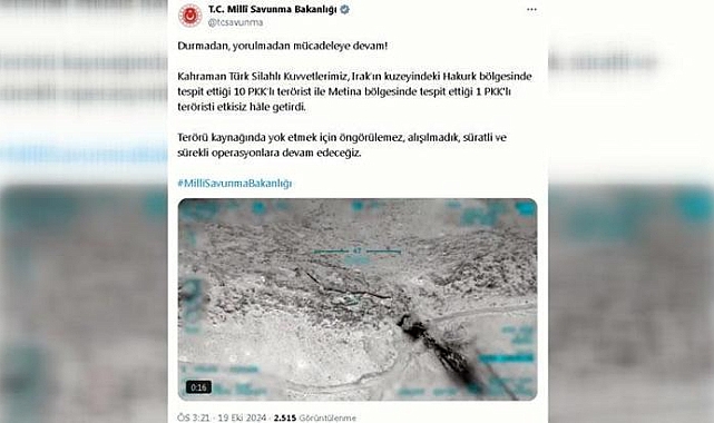 Bakanlığın sosyal medya hesabından yapılan açıklamada, "Durmadan, yorulmadan mücadeleye devam. Kahraman Türk Silahlı Kuvvetlerimiz, Irak'ın kuzeyindeki Hakurk bölgesinde tespit ettiği 10 PKK'lı terörist ile Metina bölgesinde tespit ettiği 1 PKK'lı teröristi etkisiz hale getirdi. Terörü kaynağında yok etmek için öngörülemez, alışılmadık, süratli ve sürekli operasyonlara devam edeceğiz" denildi.