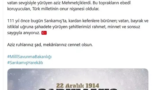 Bakanlığın sosyal medya hesabından yayımlanan anma mesajında, "Yürekleri üşüten destan: Sarıkamış. Vatan uğruna canını hiçe sayan, imkansıza karşı inancıyla yürüyen, emre itaatte ve fedakarlıkta tarihe mühür vuran Sarıkamış'ın kahraman evlatları. Onlar, silahından önce yüreğini kuşanan; soğuğa, yokluğa ve ölüme karşı vatan sevgisiyle yürüyen aziz Mehmetçiklerdi. Bu toprakların ebedi koruyucuları, Türk milletinin onur nişanesi oldular. 111 yıl önce bugün Sarıkamış'ta, kardan kefenlere bürünen; vatan, bayrak ve istiklal uğruna şahadete yürüyen şehitlerimizi rahmet, minnet ve sonsuz saygıyla anıyoruz. Aziz ruhlarınız şad, mekanlarınız cennet olsun" ifadelerine yer verildi.