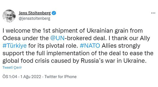 NATO Genel Sekreteri Jens Stoltenberg, Odesa limanından ayrılarak Lübnan’ın başkenti Beyrut’a doğru yola çıkan tahıl gemisi Razoni’ye dair açıklamada bulundu. stoltenberg sosyal medya hesabı üzerinden yaptığı açıklamada, “Birleşmiş Milletler’in (BM) aracılığında yapılan anlaşma kapsamında Odesa’dan yapılan Ukrayna tahılının ilk sevkiyatını memnuniyetle karşılıyorum. Bu önemli rolü için müttefikimiz Türkiye’ye teşekkür ediyorum. nato müttefikleri Rusya’nın Ukrayna’daki savaşının neden olduğu küresel gıda krizini hafifletmek için anlaşmanın tam olarak uygulanmasını güçlü bir şekilde destekliyor” ifadelerine yer verdi.