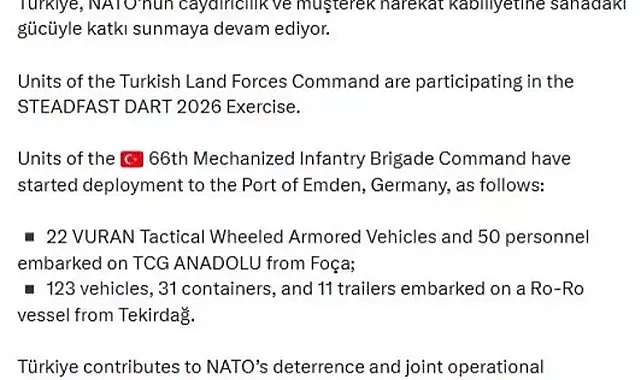 Milli Savunma Bakanlığı’nın sanal medya hesabından yapılan açıklamada, "Kara Kuvvetleri Komutanlığı unsurları, STEADFAST DART 2026 Tatbikatı'na katılıyor. Bu kapsamda 66'ncı Mekanize Piyade Tugay Komutanlığı’na ait 22 adet VURAN ve 50 personel TCG Anadolu ile Foça'dan, 123 araç, 31 konteyner ve 11 römork ise sivil Ro-Ro gemisiyle Tekirdağ'dan Emden/Almanya Limanı'na intikale başladı. Türkiye, NATO'nun caydırıcılık ve müşterek harekat kabiliyetine sahadaki gücüyle katkı sunmaya devam ediyor" denildi.