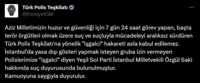 Türk Polis Teşkilatı'nın resmi Twitter hesabından, "Polislerimize 'işgalci' diyen HDP İstanbul Milletvekili Özgül Saki hakkında suç duyurusunda bulunulmuştur" açıklaması geldi.