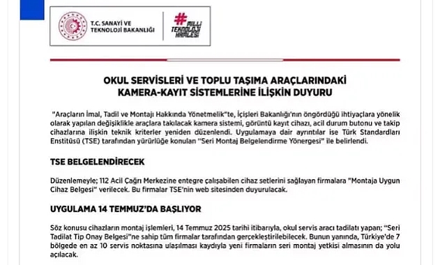 Bakanlığın sosyal medya hesabından, okul servisleri ve toplu taşıma araçlarındaki kamera-kayıt sistemlerine ilişkin açıklama yapıldı. Açıklamada, 'Araçların İmal, Tadil ve Montajı Hakkında Yönetmelik'te, İçişleri Bakanlığı'nın öngördüğü ihtiyaçlara yönelik olarak yapılan değişiklikle araçlara takılacak kamera sistemi, görüntü kayıt cihazı, acil durum butonu ve takip cihazlarına ilişkin teknik kriterlerin yeniden düzenlendiği belirtildi. Uygulamaya dair ayrıntıların ise Türk Standartları Enstitüsü (TSE) tarafından yürürlüğe konulan 'Seri Montaj Belgelendirme Yönergesi' ile belirlendiği kaydedilerek, "Düzenlemeyle; 112 Acil Çağrı Merkezine entegre çalışabilen cihaz setlerini sağlayan firmalara 'Montaja Uygun Cihaz Belgesi' verilecek. Bu firmalar TSE'nin web sitesinden duyurulacak. Söz konusu cihazların montaj işlemleri, 14 Temmuz 2025 tarihi itibarıyla, okul servis aracı tadilatı yapan; 'Seri Tadilat Tip Onay Belgesi'ne sahip tüm firmalar tarafından gerçekleştirilebilecek. Bunun yanında, Türkiye'de 7 bölgede en az 10 servis noktasına ulaşılması kaydıyla yeni firmaların seri montaj yetkisi almasının da yolu açılacak" ifadeleri kullandı.‘ACİL ÇAĞRI MERKEZİ İLE DOĞRUDAN BAĞLANTILI OLACAK'Söz konusu sistemlerin çalışır durumda olduklarının montaj yapıldığı andan itibaren tespit edileceği vurgulanarak, "Cihazlardaki uygun maliyetli SIM kartlar vasıtasıyla 112 ile veri iletişimi tesis edilerek, insan odaklı daha güvenli seyahat sağlanacak. Yeni düzenleme ile; cihaz tedarikinden sorumlu firmalar ve montaj faaliyetini yürüten firmalar birbirinden ayrılıyor. Cihaz setleri standart hale getiriliyor. Araçlara kaliteli, izlenebilir ve güvenli cihaz montajı yapılıyor. Cihaz-araç eşleşmesiyle İçişleri Bakanlığı tarafından konum takibi kolaylaşıyor. Uygulamaya okul servisleriyle başlanacak, akabinde cihazlar tüm toplu taşıma araçlarına takılacak. Cihaz bilgileri, araçların şasi numaraları ile eşleştirilecek ve izlenebilecek" denildi.