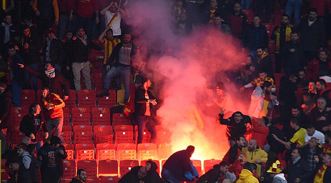 İzmir'in Spor Toto 1'inci Lig'de yer alan iki temsilcisi Göztepe ile Altay arasında oynanan müsabakanın 19'uncu dakikasında Altay tribünlerinden Göztepeli taraftarların bulunduğu tribüne atılan işaret fişeği ile Mehmet Çakır yaralandı.Sağlık ekipleri yaralıya müdahale ederken, sahaya atlayan bir Göztepe taraftarı, korner bayrağı direğiyle rakip takımın kalecisi Ozan Evrim'e saldırdı. Evrim, başına aldığı darbeyle yaralandı. 2 yaralı, hastaneye kaldırıldı. Büyüyen olaylar nedeniyle müsabaka tatil edildi.TOPLAM 21 ŞÜPHELİ GÖZALTINDAKarşılaşmanın tatil edilmesinin ardından soruşturma başlatıldı. Göztepe taraftarları stadı terk ederken, Altay taraftarları ise yaklaşık 7 saat stadyumda bekletildi. Başlatılan soruşturma kapsamında İzmir Valiliği'nden yapılan açıklamada, sis bombası ve işaret fişeğinin statta görevli özel ambulans şoförleri A.K. ve H.G. tarafından karşılamadan önce Altaylı taraftarların bulunduğu yerdeki tuvalete saklandığı belirtildi. Şoförlerin, saat 16.34'te 2 sırt çantasıyla misafir tribününün bulunduğu tuvalete girdiği ve tuvaletten çantasız çıktığı tespit edildi. Polis ekipleri 2 ambulans şoförü ve irtibatta oldukları Altaylı taraftarlar ile Ozan Evrim'e saldıran Göztepe taraftarının da aralarında bulunduğu toplam 21 şüpheliyi gözaltına aldı. MÜFETTİŞ GÖREVLENDİRİLECEKGözaltına alınan şüphelilerin emniyetteki işlemleri devam ederken, ambulans şoförlerinin bağlı bulundukları özel ambulans şirketi hakkında İzmir İl Sağlık Müdürlüğü'nce idari soruşturma açıldığı öğrenildi. Soruşturma kapsamında olayla ilgili olarak Sağlık Bakanlığı tarafından müfettiş görevlendirileceği de kaydedildi. KALECİ OZAN TABURCU EDİLDİÖte yandan, başına aldığı darbeler sonucu İzmir'de özel bir hastaneye kaldırılan kaleci Ozan Evrim'in tedavisinin ardından bugün taburcu edildiği belirtildi. İşaret fişeği isabet eden Mehmet Çakır'ın ise Dokuz Eylül Üniversitesi Hastanesi'ndeki tedavisinin sürdüğü bildirildi.