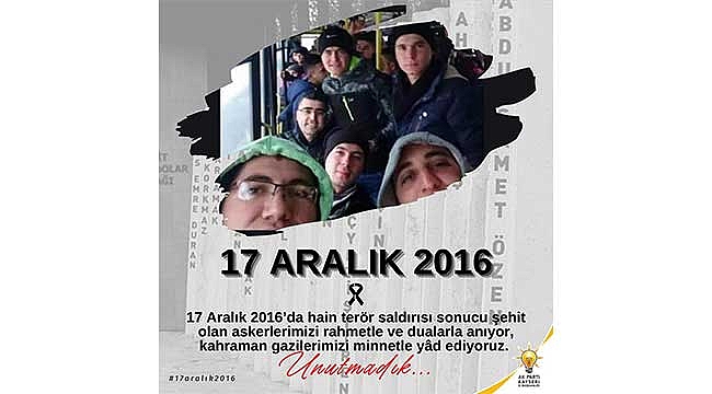 17 Aralık 2016 tarihinde 1.Komanda Tugayı’ndan çarşı iznine çıkan askerlerimize düzenlenen hain terör saldırısı sonucu şehit düşen 15 Mehmetçiğimizi, şehadetlerinin 6. yılında rahmet ve minnetle anıyoruz. Ruhları şad, mekanları cennet olsun. " dedi.