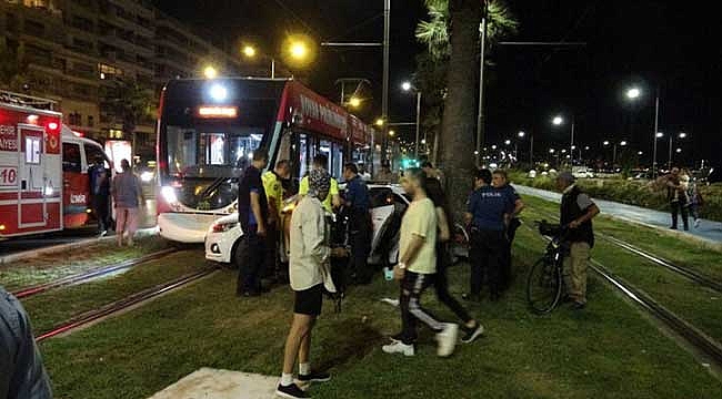 İzmir'in Karşıyaka ilçesinde, sürücüsünün kontrolünden çıkan otomobil tramvay hattına uçtu. Otomobilin tramvay hattı ile bisiklet yolu arasındaki bir ağaca çarpması, olası facianın önüne geçti. Kazada yaralanan sürücünün süratli ve alkollü olduğu öne sürüldü.