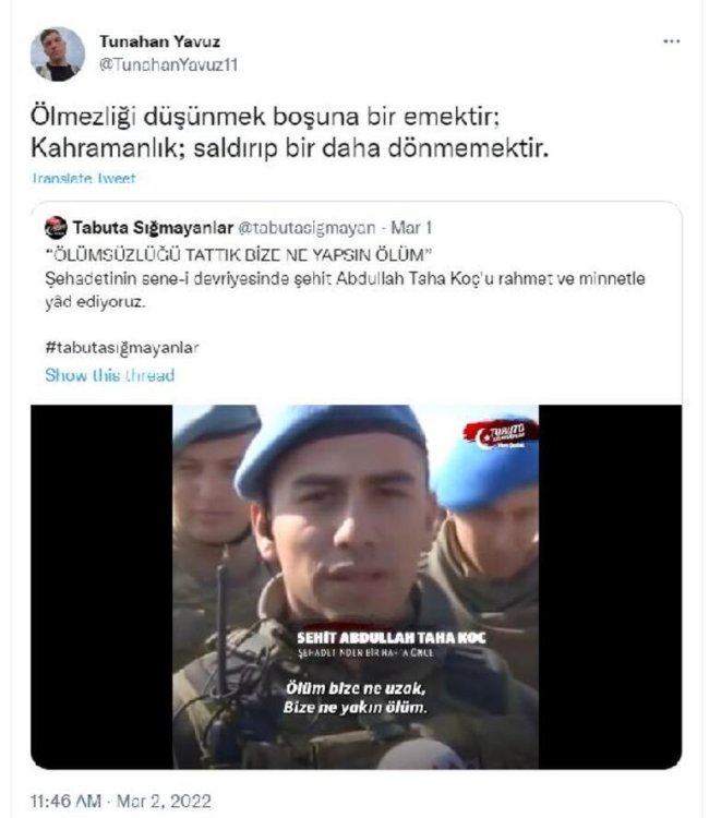 Kuzey Irak'ta yürütülen Pençe-Kilit Harekatı bölgesinde yaralanan Piyade Komando Üsteğmen Tunahan Yavuz, tedavi gördüğü hastanede yaşamını yitirdi. Şehit Üsteğmen Tunahan Yavuz'un, bir süre önce Zeytin Dalı Harekatı'nda şehit düşen Jandarma Astsubay Abdullah Taha Koç'un görüntüsünü, "Ölmezliği düşünmek boşuna bir emektir; Kahramanlık; saldırıp bir daha dönmemektir" notu ile sosyal medya hesabından paylaştığı görüldü.