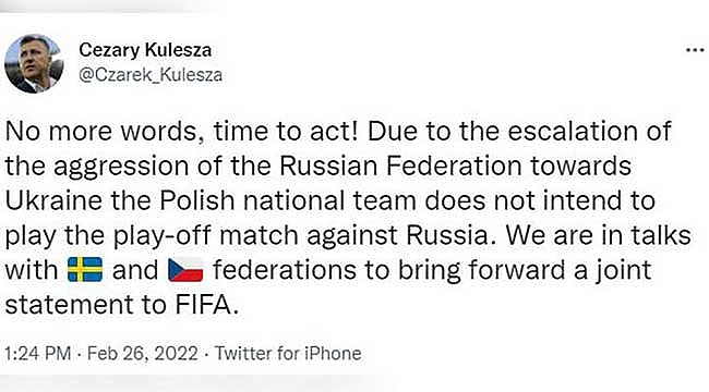 Polonya Futbol Federasyonu Başkanı Kulesza, yaptığı açıklamada, “Daha fazla söze gerek yok, harekete geçme zamanı. Rusya Federasyonu'nun Ukrayna'ya yönelik saldırganlığının artması nedeniyle, polonya Milli Takımı Rusya'ya karşı oynanması planlanan eleme maçına çıkmayı düşünmüyor. İsveç ve Çekya Federasyonları ile FIFA'ya ortak bir açıklama iletmek için görüşme halindeyiz” dedi.
