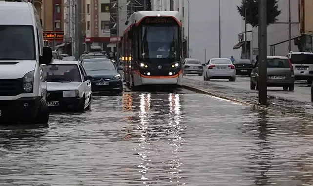 Eskişehir'de etkili olan sağanak günlük yaşamı olumsuz etkilerken, araçlar ile tramvay, göle dönen yolda ilerleyemedi.