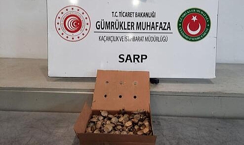 Ticaret Bakanlığı'na bağlı Gümrük Muhafaza ekiplerince Sarp Sınır Kapısı'nda yapılan kontrolde, bir kişinin sırtına bantladığı kutuda 250 istilacı su kaplumbağası ele geçirildi.