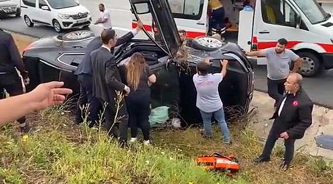Kaza, saat 13.30 sıralarında, İstanbul-Bursa-İzmir yolu kuzey gişeleri mevkisinde meydana geldi. AK Parti 26’ncı dönem Bursa Milletvekili Bennur Karaburun’un bugün yapılacak düğününe katılmak için Bursa’ya gelen TBMM Başkanı Mustafa Şentop’un koruma ekibinin bulunduğu otomobil, şiddetli yağmur nedeniyle kontrolden çıkarak, şarampole devrildi.
