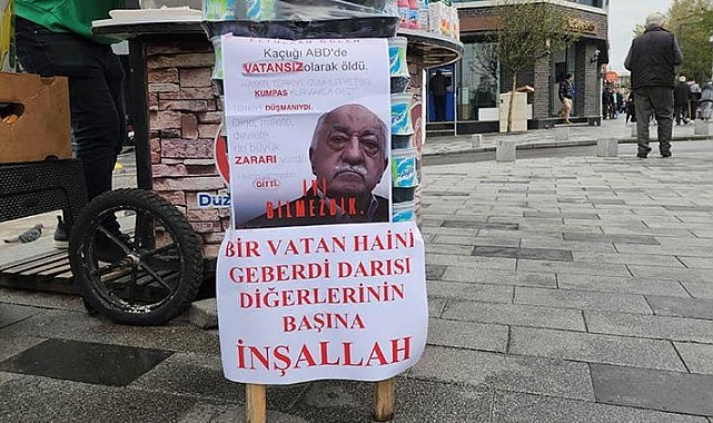 Düzce’de seyyar simitçi Ercan Biltaş (33), FETÖ elebaşı Fetullah Gülen’in ölümünün ardından tezgahına ‘Bir vatan haini geberdi. Darısı diğerlerinin başına inşallah’ yazısı asıp vatandaşlara tatlı dağıttı. Biltaş, “İnşallah tüm vatan hainleri aynı akıbeti yaşar ve vatansız ölürler” dedi.