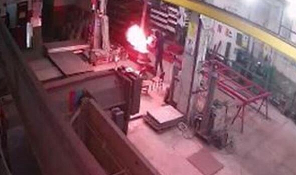 Gümüşhane 'de İhsan Kaplan (39), çalıştığı iş yerinde sobaya döktüğü tinerin parlaması sonucu yaralandı. O anlar güvenlik kamerasına yansıdı.