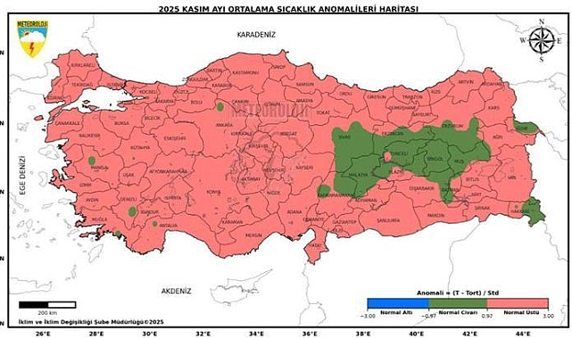Meteoroloji Genel Müdürlüğü, 2025 yılı Kasım ayı sıcaklık analizi raporunu yayımladı. Buna göre; 2025 yılı Kasım ayında ortalama sıcaklıklar, Akhisar, Gediz, Dalaman, Göksun, Acıpayam, Korkuteli, Sivas, Zara, Kangal, Kızılcahamam, Erzincan, Erzurum, Iğdır, Tunceli, Malatya, Bingöl, Muş, Hakkari, Horasan, Tercan, Divriği, Hınıs, Arapgir, Karakoçan, Solhan, Malazgirt, Palu, Baskil, Elbistan, Doğanşehir, Yüksekova, Batman ve Ceylanpınar çevrelerinde mevsim normalleri civarında gerçekleşirken; yurdun diğer bölgelerinde mevsim normallerinin üzerinde gerçekleşti. 1991-2020 normalleri kasım ayı ortalama sıcaklığı 9,3 derece olurken, 2025 yılı Kasım ayı sıcaklığı 12,2 derece ile normallerin 2,9 derece üzerinde gerçekleşti. 2025 yılı Kasım ayı, son 55 yılın en sıcak 3'üncü kasım ayı olarak kayıtlara geçti. Kasım ayında en düşük sıcaklık sıfırın altında 10 derece ile Ardahan'da, en yüksek sıcaklık 33,3 derece ile Osmaniye’de ölçüldü.