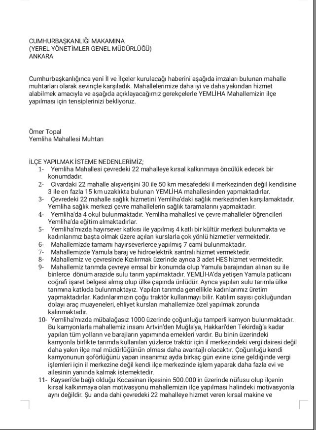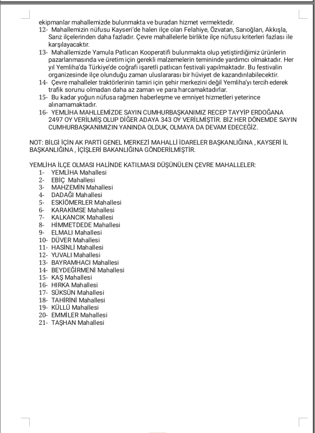 Yemliha Mahallesi ilçe olmayı talep ediyor. Kayseri'nin Yemliha Mahallesi İlçe olmak için başvuruda bulundu. Yemliha Mahallesi Muhtarı Ömer Topal"Cumhurbaşkanlığınca yeni İl ve İlçeler kurulacağı haberini aşağıda imzaları bulunan mahalle muhtarları olarak sevinçle karşıladık. Mahallelerimize daha iyi ve daha yakından hizmet alabilmek amacıyla ve aşağıda açıklayacağımız gerekçelerle YEMLİHA Mahallemizin ilçe yapılması için tensiplerinizi bekliyoruz." dedi. İLÇE YAPILMAK İSTEME NEDENLERİMİZ;