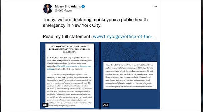 New York Belediye Başkanı Eric Adams, yaptığı açıklamada, “Bugün New York'ta Maymun Çiçeği hastalığı nedeniyle halk sağlığı acil durumu ilan ediyoruz. Geçtiğimiz birkaç hafta içinde, insanları güvende tutmak için aşı ve tedaviye erişimi genişletmek için mümkün olduğunca hızlı hareket ettik” dedi.“150 BİN KİŞİ RİSK ALTINDA”Adams, kentin Maymun Çiçeği virüsünde merkez üssü olduğunu ve 150 bin kişinin risk altında olduğunu ifade ederek, “New York şu anda salgının merkez üssü ve yaklaşık 150 bin New Yorklunun şu anda Maymun Çiçeği riski altında olabileceğini tahmin ediyoruz. Federal ortaklarımızla birlikte çalışmaya devam edeceğiz” dedi. Cuma günü itibarıyla New York’ta tespit edilen Maymun Çiçeği vaka sayısı 1345 olarak açıklandı.