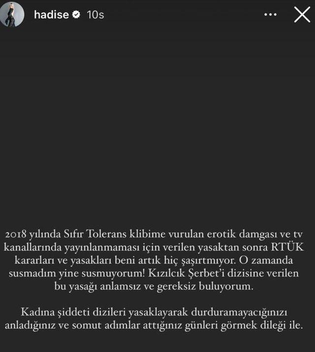 Sosyal medya hesabından yaptığı paylaşımda RTÜK'ün kendisine verdiği cezayı hatırlatan Hadise, şu ifadeleri kullandı: "2018 yılında Sıfır Tolerans klibine vurulan erotik damgası ve TV kanallarında yayınlanmaması için verilen yasaktan sonra RTÜK kararları ve yasakları beni artık hiç şaşırtmıyor. O zaman da susmadım yine susmuyorum! Kızılcık Şerbet'i dizisine verilen bu yasağı anlamsız ve gereksiz buluyorum. Kadına şiddeti dizileri yasaklayarak durduramayacağınızı anladığınız ve somut adımlar attığınız günleri görmek dileği ile..."