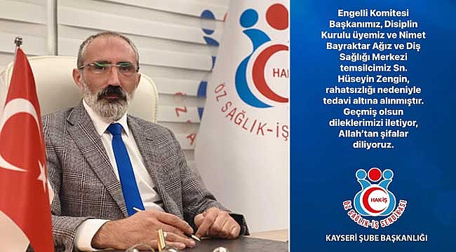 Öz Sağlık-İş Sendikası Kayseri Şube Başkanı Emre Kocaman, rahatsızlığı nedeniyle Kayseri Şehir Hastanesi’nde tedavisi devam eden Engelli Komitesi Başkanı, Disiplin Kurulu üyesi ve aynı zamanda Nimet Bayraktar Ağız ve Diş Sağlığı Hastanesi temsilcisi olan Hüseyin Zengin için geçmiş olsun dileklerinde bulundu.