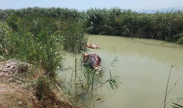 Mersin'in Silifke ilçesinde sulama kanalında ölü 2 büyükbaşa rastlandı. Kokudan rahatsız olan Ali Mavili, "Daha önce de hayvan ölüleri gördük. Kepçe getirip çıkarttık. Sürekli hayvan ölüsü görüyoruz. Buradan balık tutuluyor, önlem alınmasını istiyoruz" dedi.