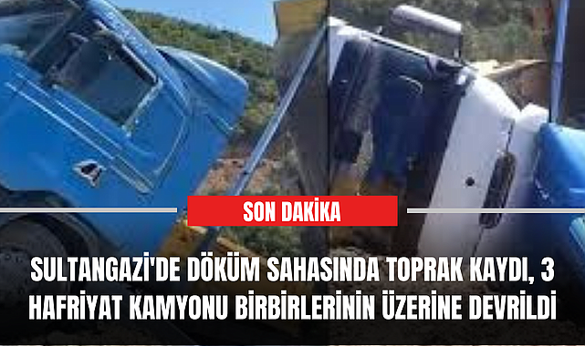 Sultangazi'de döküm sahasında toprak kaydı, 3 hafriyat kamyonu birbirlerinin üzerine devrildi