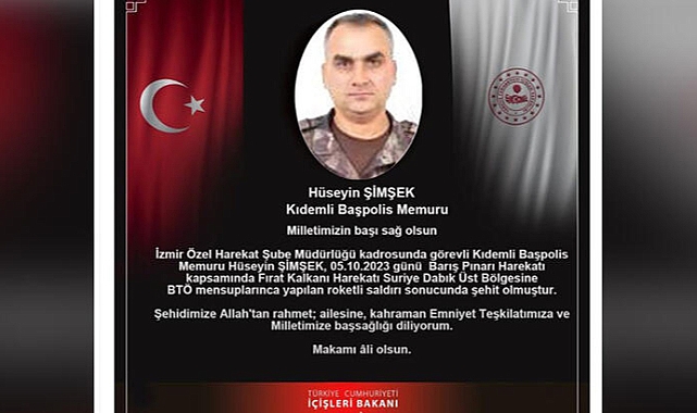 Bakan Yerlikaya, sosyal medya hesabından yaptığı açıklamada, "İzmir Özel Harekat Şube Müdürlüğü kadrosunda görevli Kıdemli Başpolis Memuru Hüseyin Şimşek, 5 Ekim 2023 günü Barış Pınarı Harekatı kapsamında Fırat Kalkanı Harekatı Suriye Dabık Üst Bölgesine bölücü terör örgütü mensuplarınca yapılan roketli saldırı sonucunda şehit olmuştur. Şehidimize Allah'tan rahmet; ailesine, kahraman Emniyet Teşkilatımıza ve milletimize başsağlığı diliyorum. Makamı ali olsun" dedi.