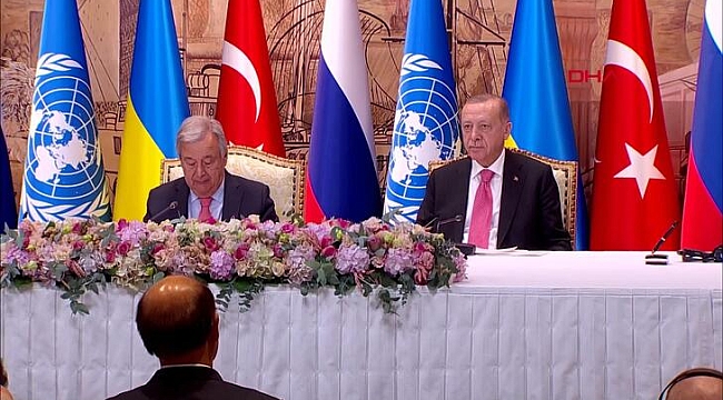 "YENİ BİR NEFES BORUSU AÇMIŞ OLACAĞIZ"Erdoğan, "Önümüzdeki günlerde başlayacak gemi trafiğiyle Karadeniz'den dünyanın birçok ülkesine yeni bir nefes borusu açmış olacağız. Gemilerin çıkışından güvenli bir şekilde intikal eden ve varacağı limana ulaşmasına kadar tüm süreçler üzerinden mutabakat tesis edildi. Bu son derece önemli planın icrası ve denetimi İstanbul'da kurulacak Müşterek Koordinasyon Merkezi tarafından gerçekleştirilecektir. Planın başarıyla uygulanmasında uluslararası toplumun desteği de şüphesiz büyük önem taşıyor. Bundan yaklaşık 4 ay önce yine İstanbul'da Ukrayna ve Rusya arasında ev sahipliğimizde yapılan müzakerelerde mesafe kat etmiş, savaşın sona ereceğine dair ümitleri yeşertmiştik. Maalesef o toplantı sonrasında meydana gelen gelişmeler çatışmaları körükledi. Başından beri bu savaşın kazananı olmayacağını sadece tarafların değil, tüm dünyanın kayba uğrayacağını ifade ediyoruz. Yaklaşık 5 aydır aralıksız devam eden çatışmalar ve bunun küresel etkileri ne yazık ki, bu öngörümüzü doğruluyor. Silahların susması uzadıkça ekonomik maliyetlerin yanı sıra insani kayıplar da artıyor. Savaş sadece tarafları sadece bölge ülkelerini değil, dünyanın en ücra köşesindekiler dâhil tüm insanlığı olumsuz etkiliyor. Ancak bu gidişatın mukadder olmadığına da inanıyoruz. Masumların hayatına mal olan bu çatışmaların bir an önce sona ermesini arzu ediyoruz" ifadelerini kullandı."SAVAŞ NİHAYETİNDE MÜZAKERE MASASINDA SONLANACAKTIR"Erdoğan sözlerini şöyle noktaladı: "Adil bir barışın kaybedeninin olmayacağı hepimizin malumudur. Bugün Rusya ve Ukrayna tarafıyla İstanbul'da atmakta olduğumuz bu müşterek adımın barışa yönelik umutları canlandıracak yeni bir dönüm noktası olmasını canı gönülden diliyorum. Arazideki gelişmeler ne yönde seyrederse seyretsin savaş nihayetinde müzakere masasında sonlanacaktır. Tesis ettiğimiz bu dostane ve barışçıl atmosferin savaşın sonlandırılmasına yönelik adımlara tahvil edilmesi tüm insanlığın yararınadır. Medeniyet anlayışımızın bize yüklediği sorumluluğun bilinciyle. Hareket etmeyi sürdüreceğiz"