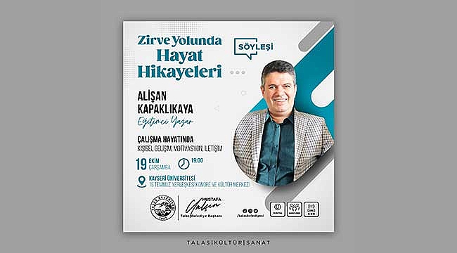 Eğitimci yazar Alişan Kapaklıkaya, Talas Belediyesi tarafından düzenlenen programla “Çalışma Hayatında Kişisel Gelişim, Motivasyon, İletişim” konulu bir söyleşi gerçekleştirecek.